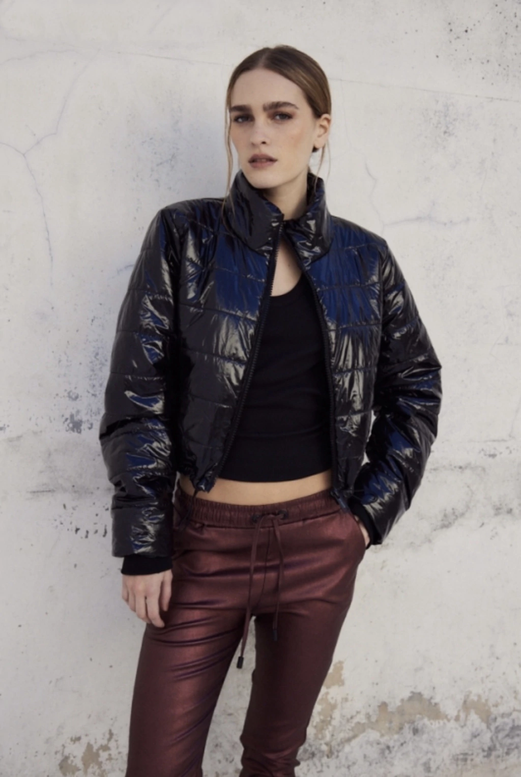 Campera puffer brillante corte crop. Pieza de goma personalizada en manga.