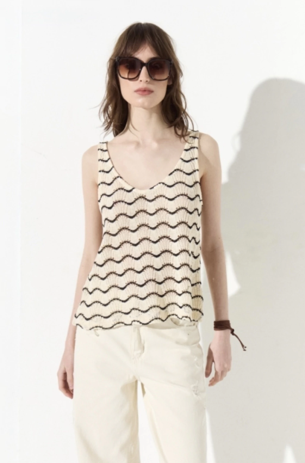 Musculosa de crochet con pequeñas caladuras, su escote redondeado está terminado con una guía interna que le brinda mayor estabilidad al producto.