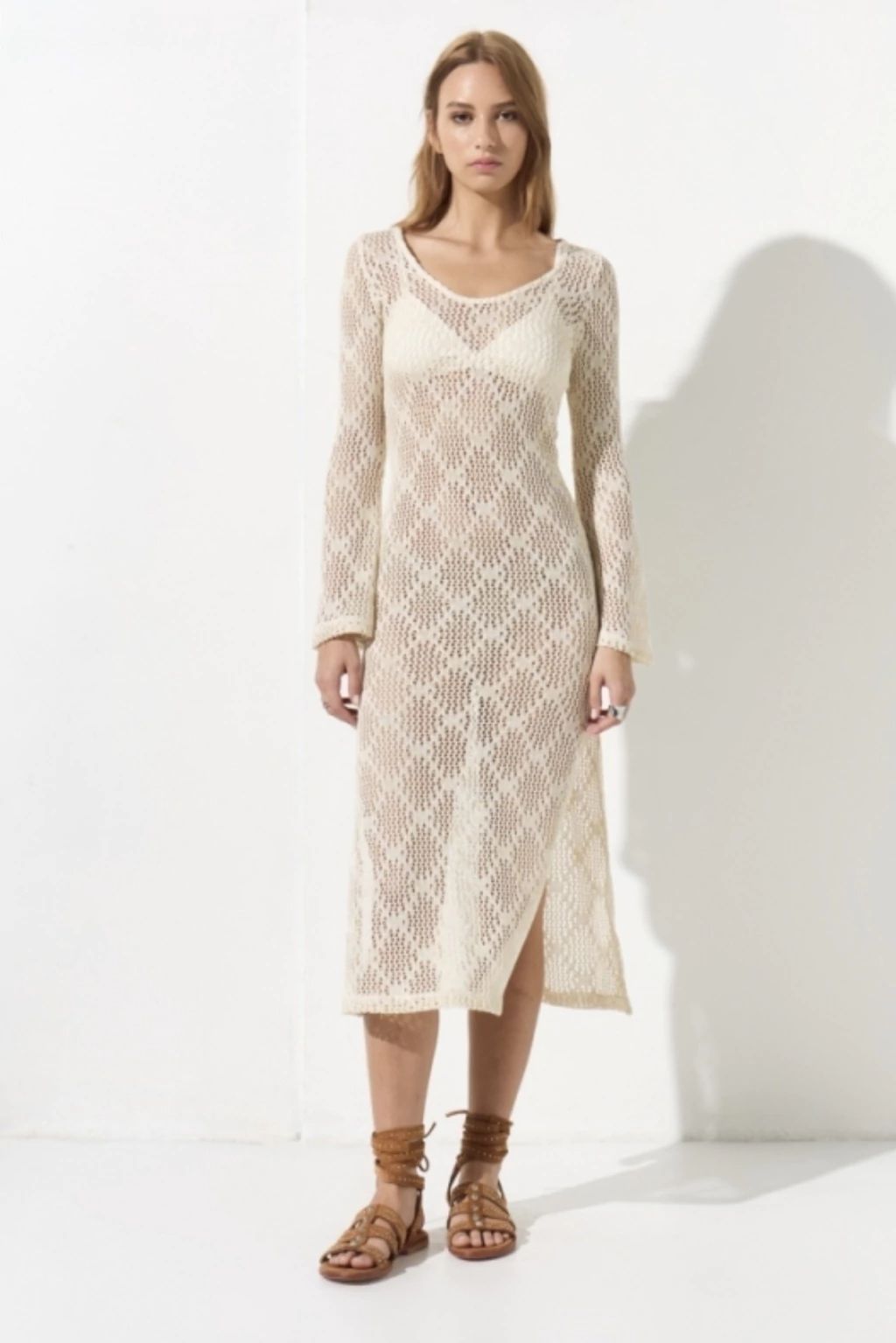 Vestido playero largo, en tela crochet, con escote cavado y tajos laterales . Lleva etiqueta rústica en centro superior de espalda.